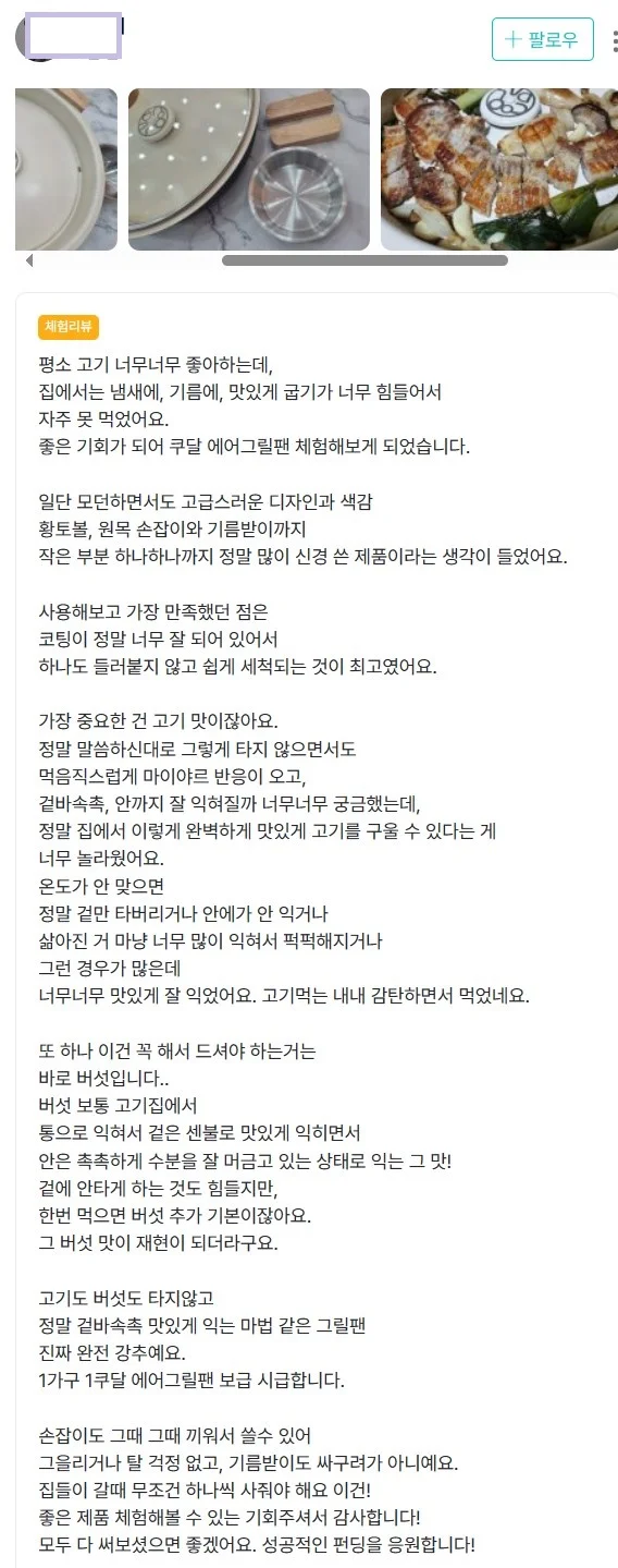 매월 본 블로그 구독자 중 일정 인원을 선정하여 쿠달 에어그릴팬 체험 기회를 제공해드립니다. 구독하시면 체험단 모집 소식을 가장 먼저 받아보실 수 있습니다.