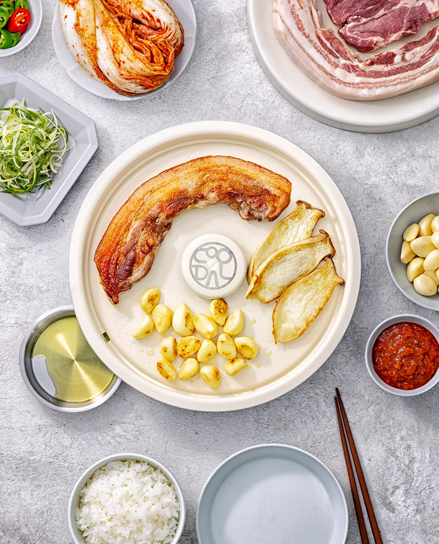 특허 번호 10-2562613호로 등록된 쿠달의 기술은 전통 구들장의 구조를 현대화하여 냄새 저감과 완벽한 열전도 시스템을 구현했습니다. 열기가 새어나가지 않아 전체가 골고루 열을 받는 구조로, 이는 고기 굽기에 가장 이상적인 환경을 만들어냅니다.